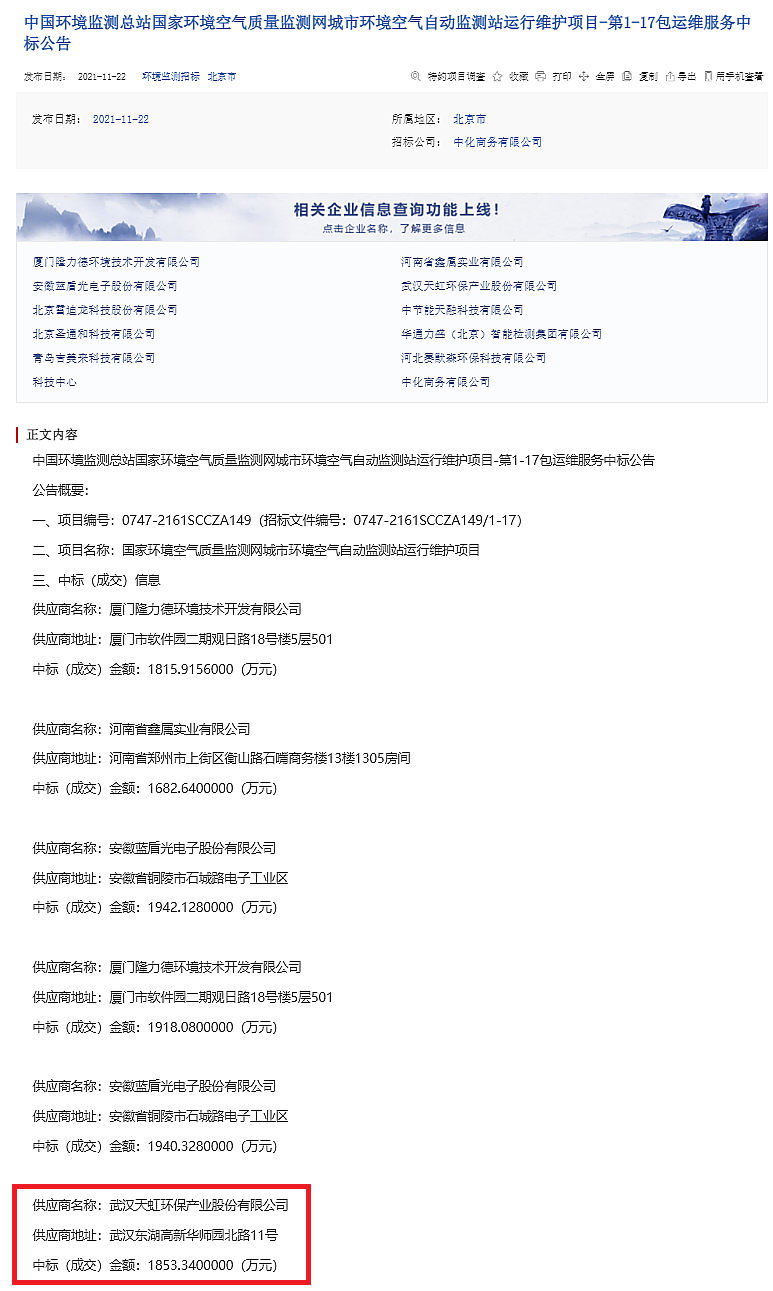 2021年11月22日,武汉918博天堂环保产业股份有限公司中标“国家环境空气质量监测网城市环境空气自动监测站《以下简称(国控城市点位)》运行维护项目”第6包(中标金额1853.34万元,覆盖安徽、河北、山东3省21个城市的115个国控城市站);第9包(中标金额1719.744万元,覆盖河南、福建2省18个城市的104个国控城市站)。