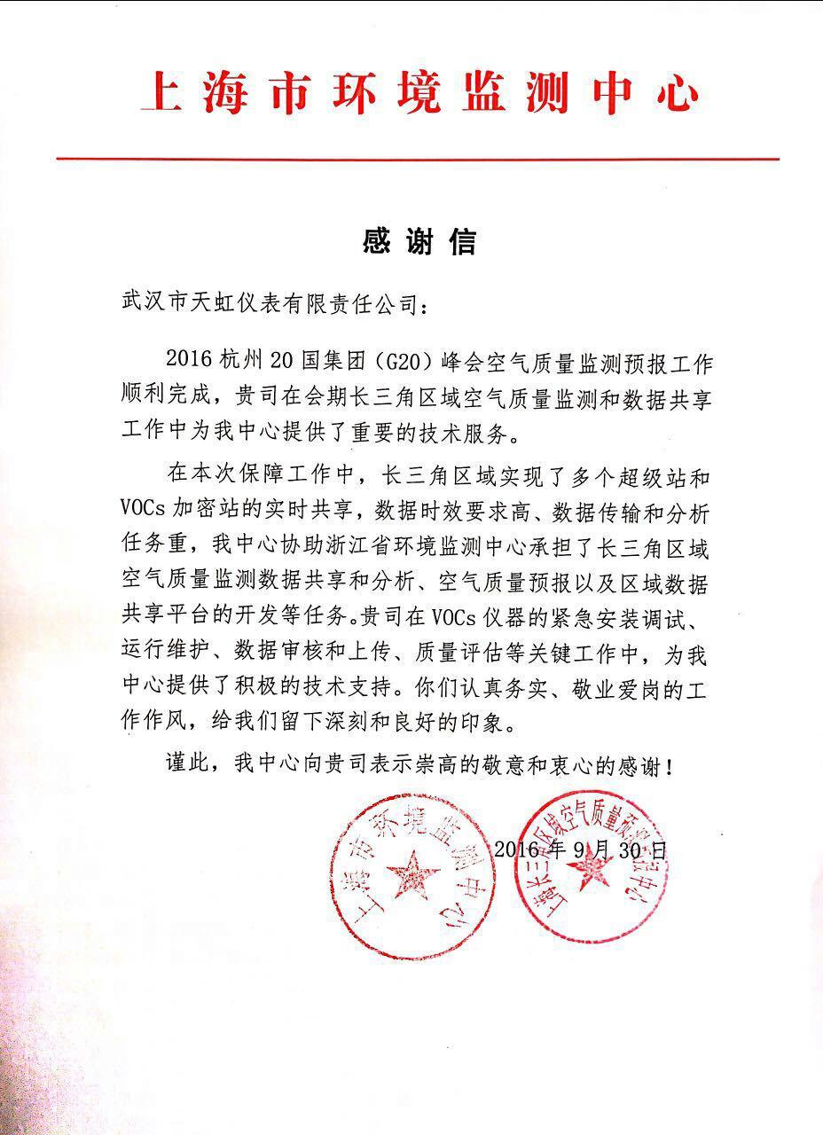 武汉918博天堂环保产业股份有限公司受国家环保部委托,派出TH-300B VOCs在线监测系统参加G20峰会长三角区域环境空气VOCs自动监测,负责上海淀山湖空气自动站,江苏宜兴市监测站空气自动站,安徽芜湖市监测站空气自动站三个站点的VOCs在线监测工作,圆满完成了各项任务。国庆节前,我公司收到了负责这次保障工作的上海市环境监测中心和上海长三角区域空气质量预测预报中心联名发来的感谢信,充分肯定了我公司的工作人员,在G20峰会长三角区域环境空气VOCs自动监测期间仪器安装调试、运行维护、数据审核和上传、质量评估等关键工作中的认真务实、敬业爱岗的工作作风,为中心提供了积极的技术支持。TH-300BVOCs在线监测系统发挥了重要作用,在线监测的VOCs项目最多。