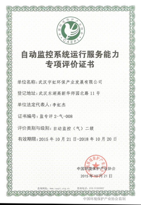 近日,武汉宇虹环保产业发展有限公司获得由中国环保产业协会颁发的自动监控系统运行服务能力专项评价证书—自动监控(气)二级。