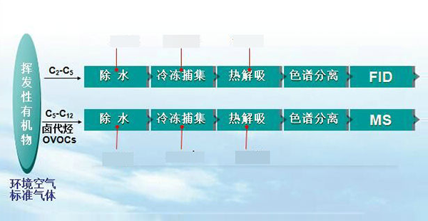 环境大气通过采样系统采集后,进入浓缩系统,在超低温条件下,大气中的挥发性有机物在空毛细管捕集柱中被冷冻捕集;然后快速加热解析,使化合物进入GCMS分析系统;经色谱柱分离后被FID和MS检测器检测。